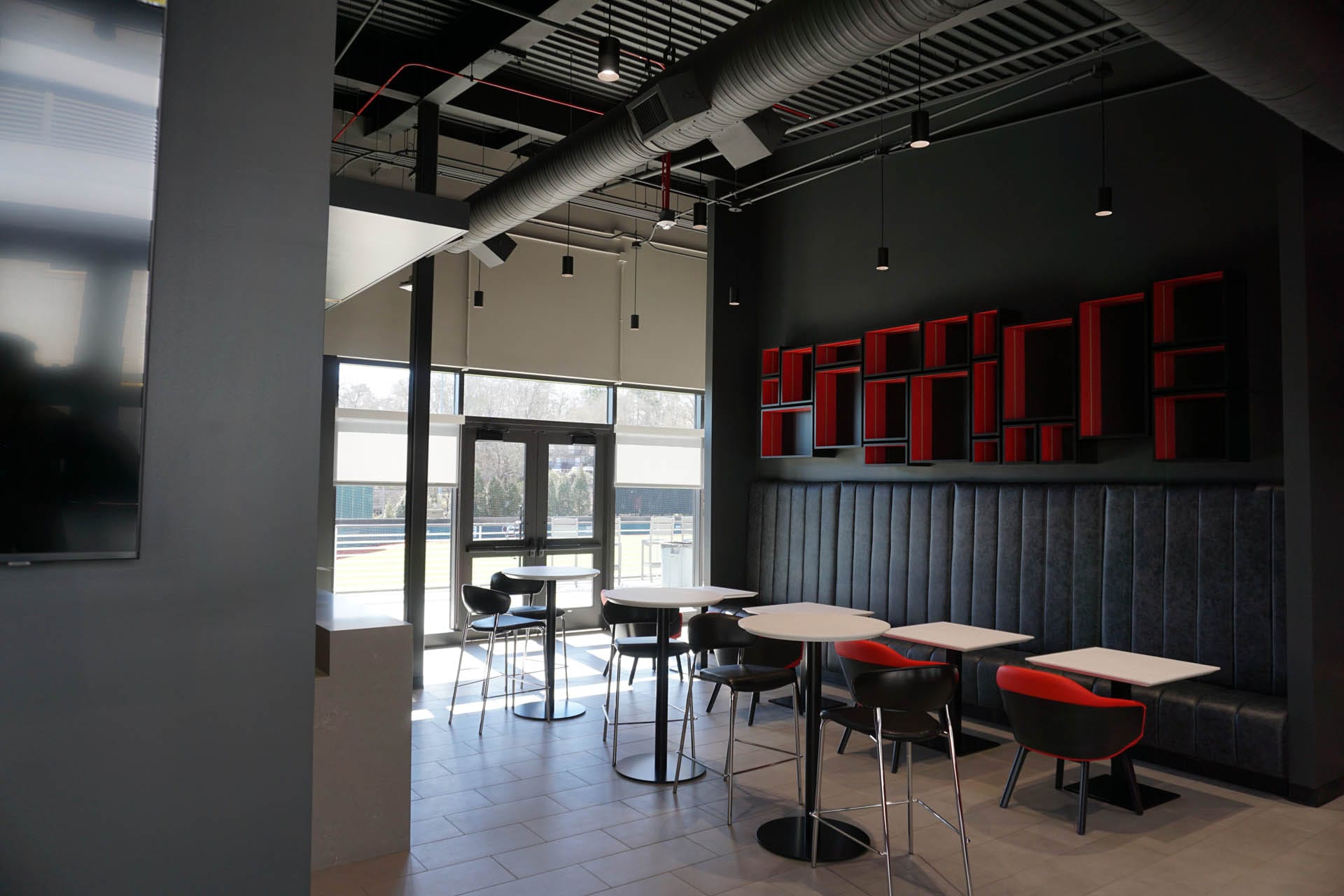 Scope of Work: Our scope included exterior metal framing and full interior framing/drywall systems, Level 5 finishing for accent paint and wall coverings, Fry Reglet reveals in select partitions, ACT ceilings, specialty Acoufelt ceiling systems, touchup of existing spaces, spray insulation, critical waterproofing elements beneath bleachers (flashing, gutters, and metal deck waterproofing), and constructing the elevated exterior platform supporting the premium seating area.