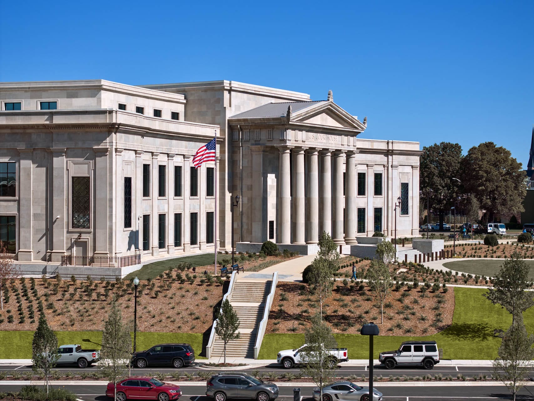 Project Description: This 126,000 sq. ft. federal U.S. Courthouse in Huntsville contains two district courtrooms, one magistrate courtroom, one special proceedings courtroom, one bankruptcy courtroom, six judges’ chambers, and a walkout basement. The facility also houses U.S. Marshals Service spaces and a full suite of U.S. District Court offices, including probation, pretrial services, divisional clerk’s offices, executive clerk’s offices, and grand jury accommodations. Designed in a neoclassical style, the three-story courthouse features a prominent pedimented entry portico framed by gently arcing symmetrical wings.