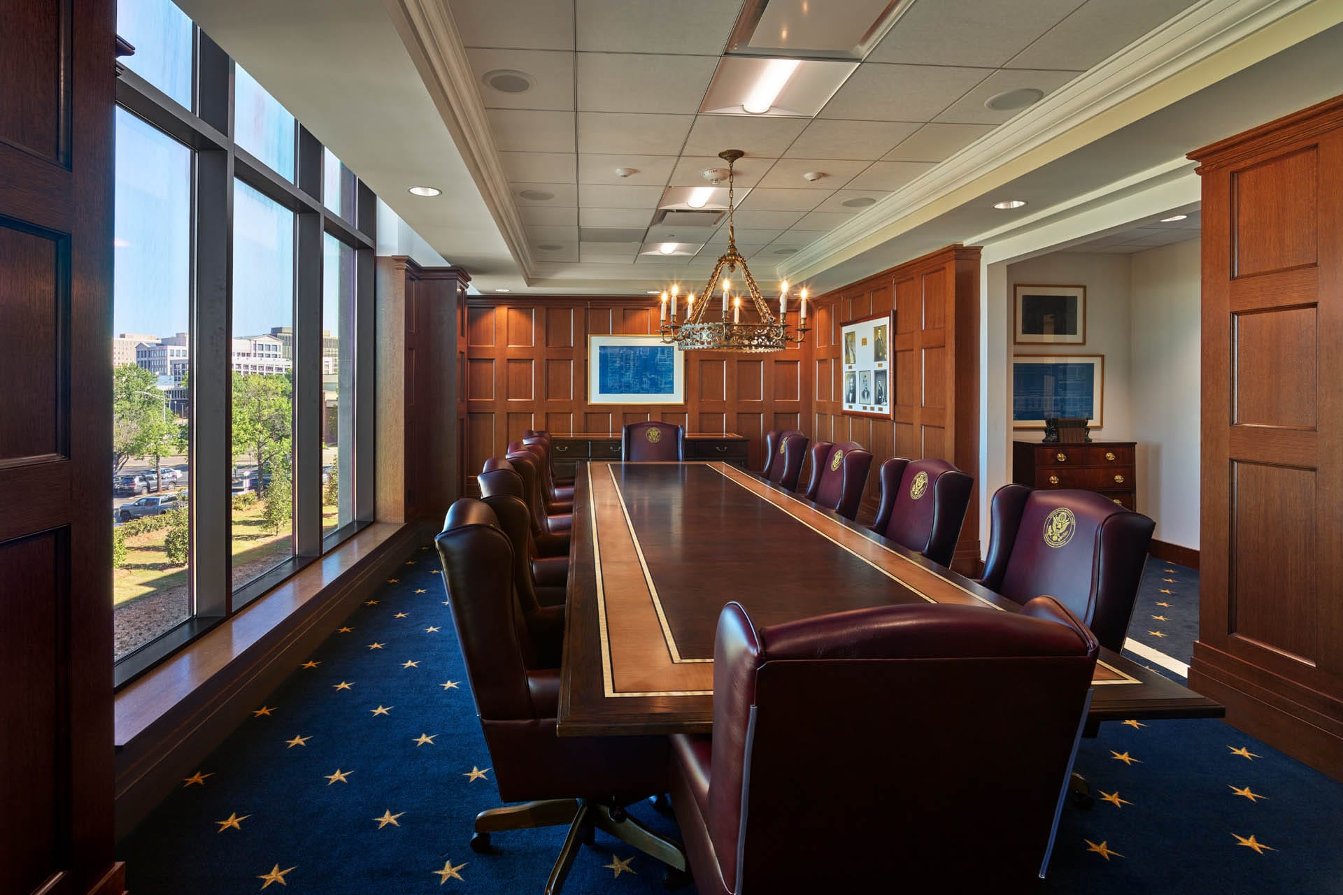 Special Challenges: Each courtroom and chamber in this building features its own distinct design and architectural elements. This included complex ceiling systems such as coffered and barrel ceilings incorporating acoustical plaster and high-end finishes. Our team delivered detailed interior and exterior assemblies that upheld the architectural design intent while meeting the project’s rigorous performance standards, including achieving the high Sound Transmission Class (STC) ratings required in federal courthouses.