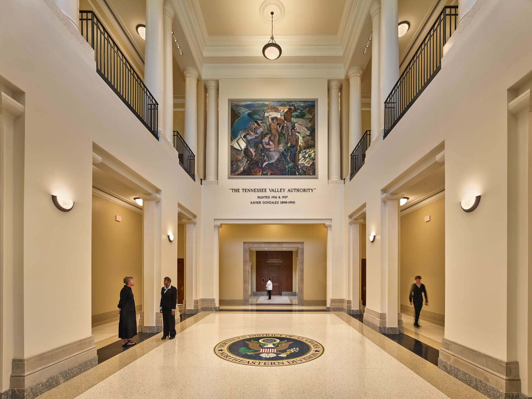 Project Description: This 126,000 sq. ft. federal U.S. Courthouse in Huntsville contains two district courtrooms, one magistrate courtroom, one special proceedings courtroom, one bankruptcy courtroom, six judges’ chambers, and a walkout basement. The facility also houses U.S. Marshals Service spaces and a full suite of U.S. District Court offices, including probation, pretrial services, divisional clerk’s offices, executive clerk’s offices, and grand jury accommodations. Designed in a neoclassical style, the three-story courthouse features a prominent pedimented entry portico framed by gently arcing symmetrical wings.