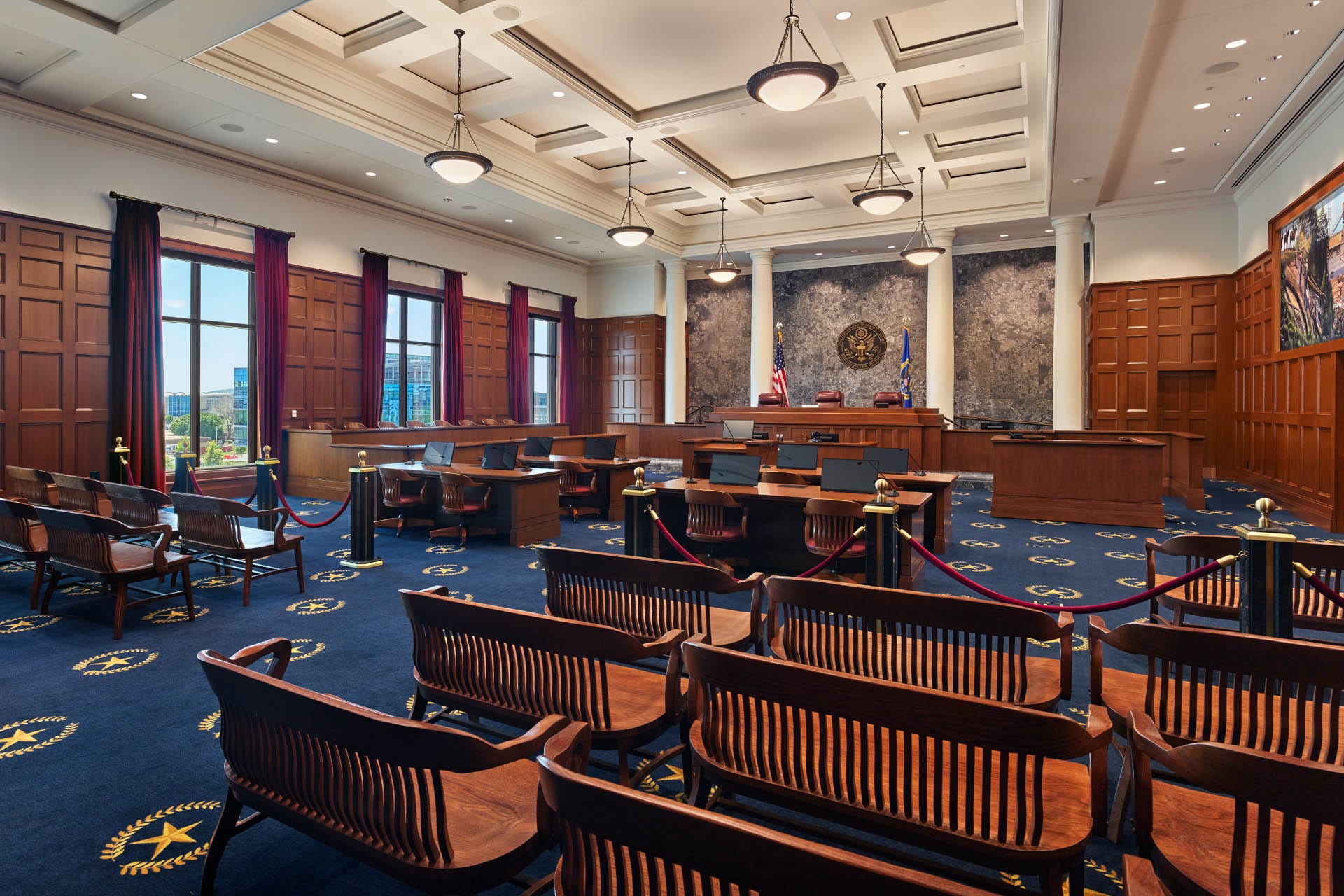 Special Challenges: Each courtroom and chamber in this building features its own distinct design and architectural elements. This included complex ceiling systems such as coffered and barrel ceilings incorporating acoustical plaster and high-end finishes. Our team delivered detailed interior and exterior assemblies that upheld the architectural design intent while meeting the project’s rigorous performance standards, including achieving the high Sound Transmission Class (STC) ratings required in federal courthouses.